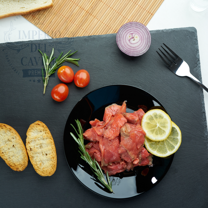 El suguaday es un aperitivo listo para comer, elaborado con el pescado salvaje más fresco del norte, que se encuentra por encima del Círculo Polar Ártico. El concepto de este excelente aperitivo es bastante simple: pescado crudo cortado en trozos pequeños, con un mínimo de sal, pimienta y un poco de aceite de girasol. También puedes agregar cebollas, salsa de soja o limón, según tu preferencia. La carne del salmón sockeye salvaje tiene un color rojo intenso. El sockeye es un salmón ampliamente distribuido a lo largo de las costas de los Estados Unidos, desde California hasta Alaska, y se encuentra en las aguas asiáticas desde la isla japonesa de Hokkaido hasta el río Anadyr en el Lejano Oriente ruso. La carne del sockeye se considera más sabrosa y delicada en comparación con otras especies de salmón. Su sabor recuerda vagamente al de los cangrejos, lo que se atribuye a la dieta de crustáceos del pescado durante su fase marina.