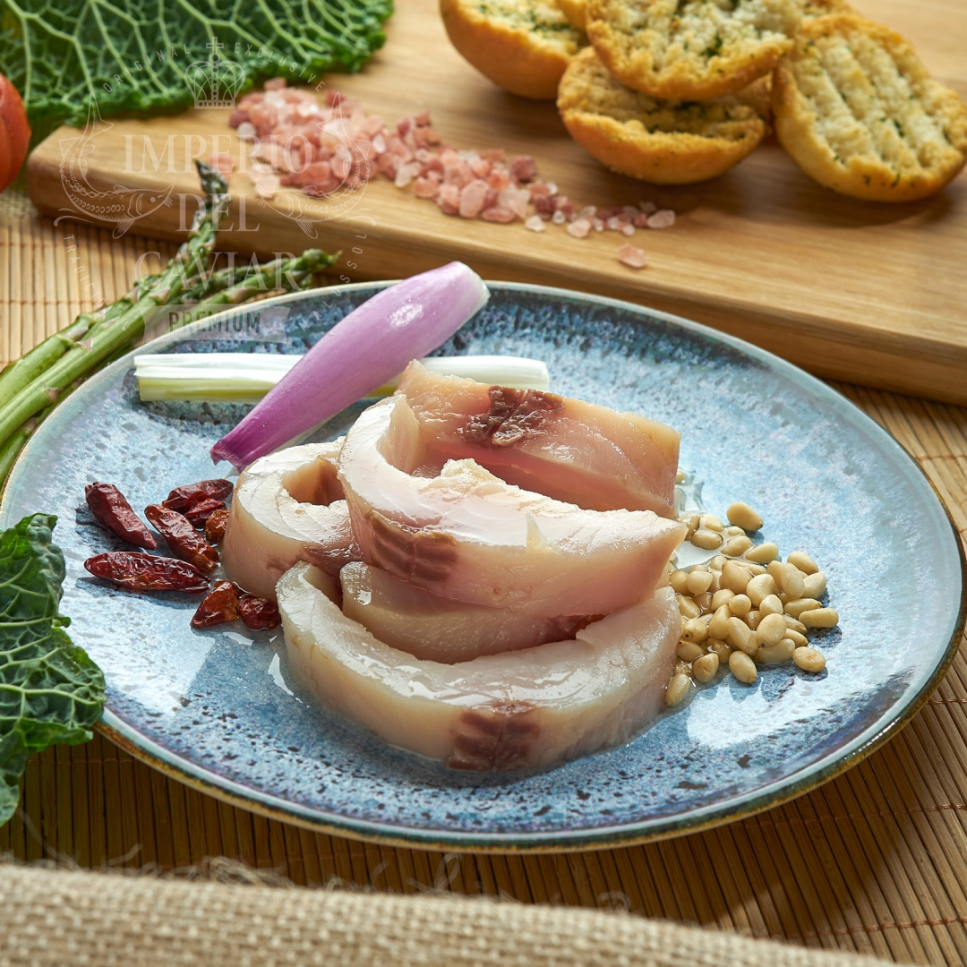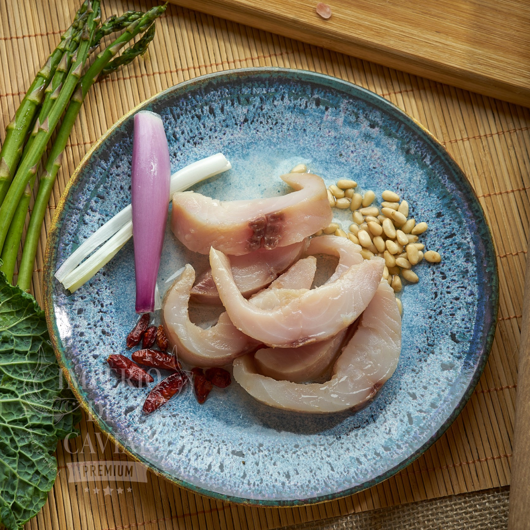 Это готовое блюдо, филе нарезанное красивыми кусочками по ширине 1-2 см, которое можно сразу подавать к столу. В составе только самые простые ингредиенты, такие как филе нельмы, минимум соли, масло.