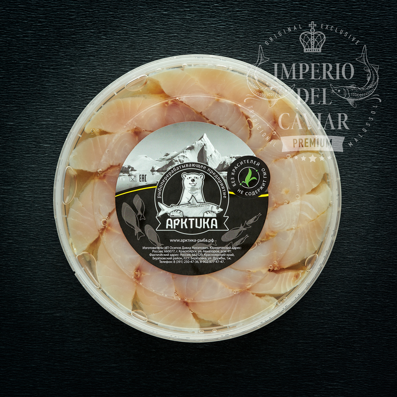 Filete de Muksun (Coregonus muksun) (PESCADO), aceite de girasol 12%, sal, conservadores (benzoato de sodio E-211, acetato de sodio E-262, sorbato de potasio E-202)