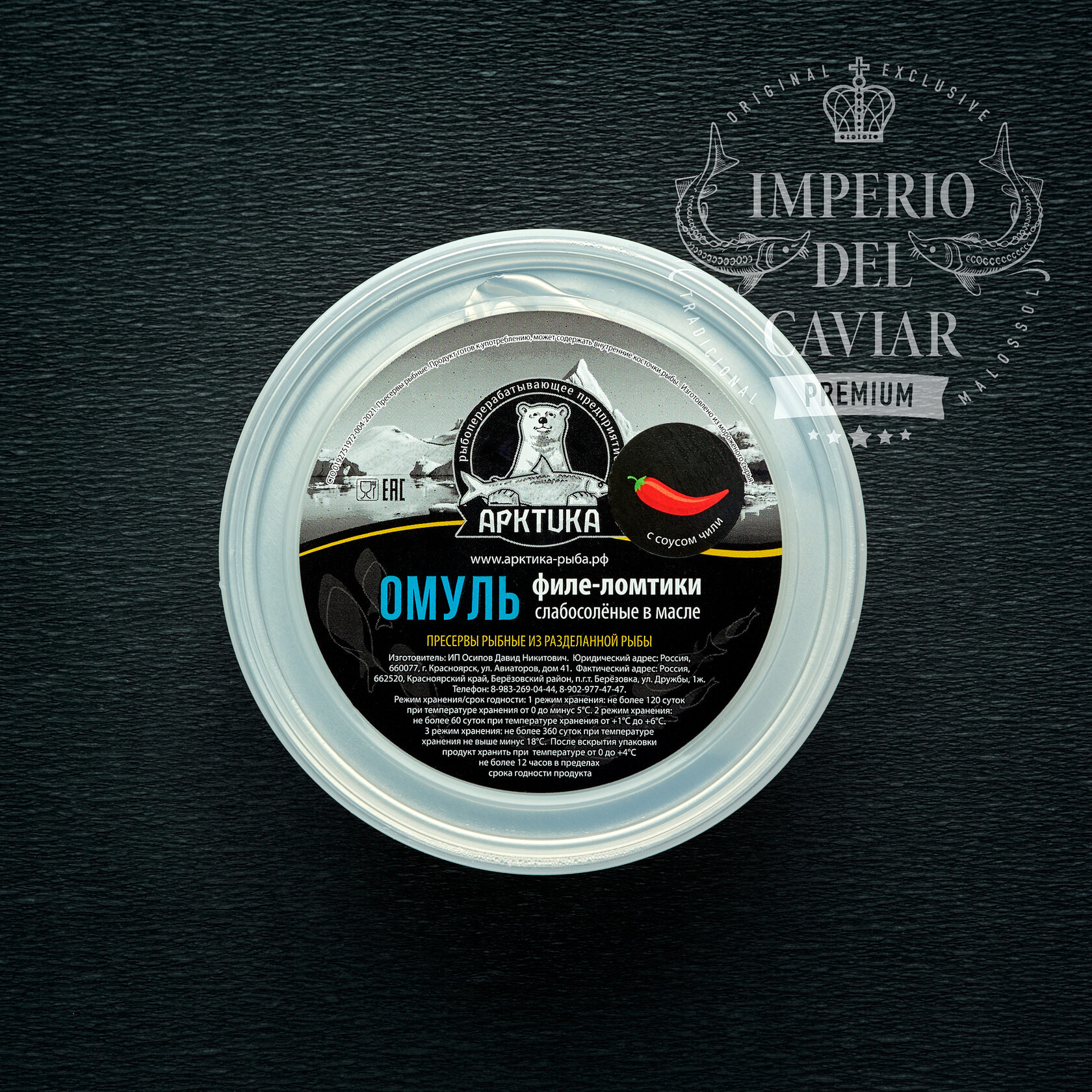 Filete de omul (Coregonus autumnalis) (PESCADO), aceite de girasol, pimienta chili, sal, conservadores (benzoato de sodio E-211, acetato de sodio E-262, sorbato de potasio E-202)